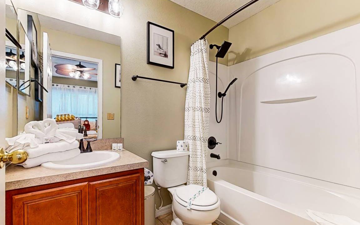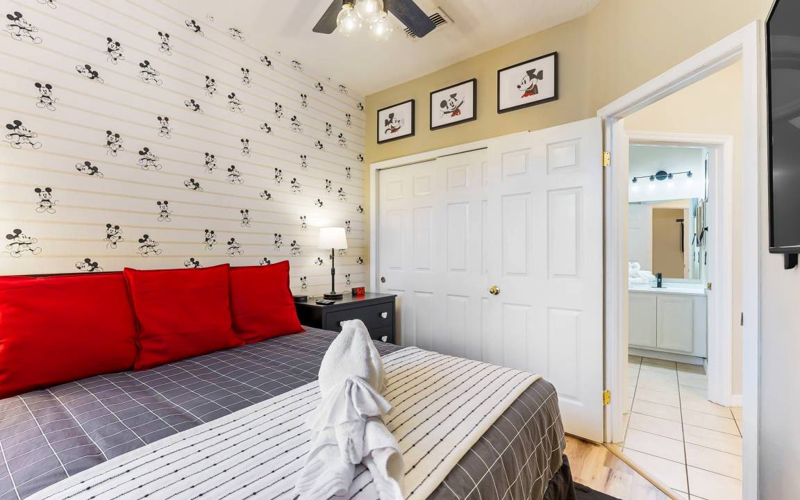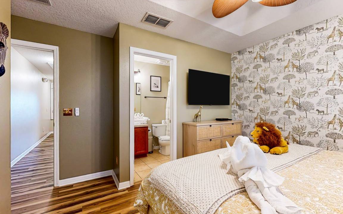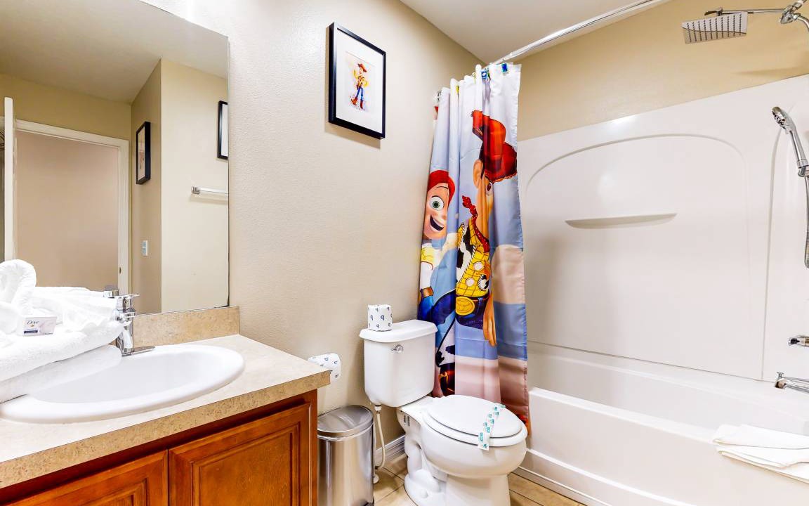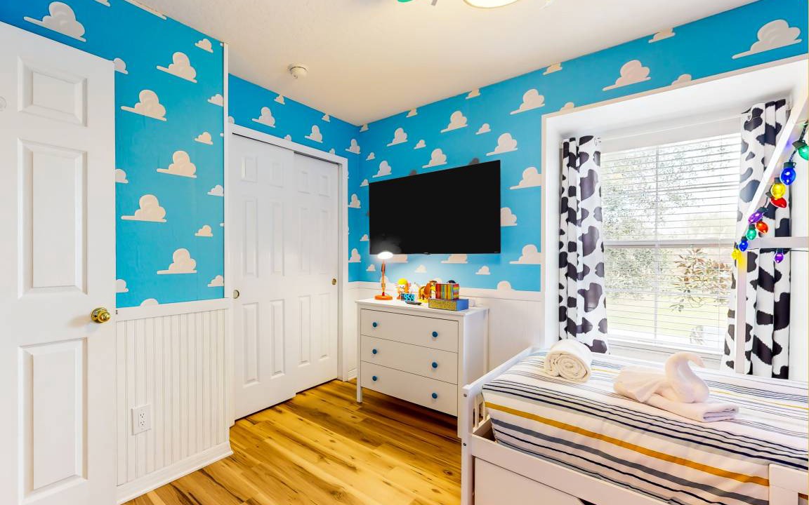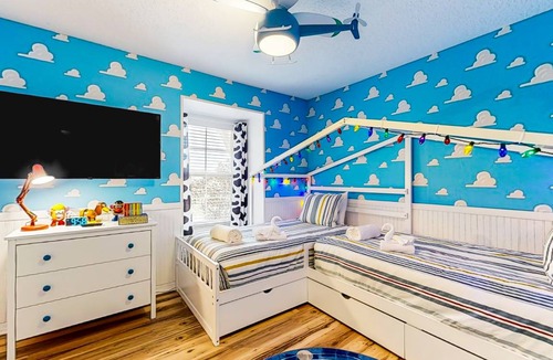 This superb vacation home boasts a welcoming open floor plan with tiled floors throughout. Curl up on the inviting sectional after a refreshing time in the community's outdoor pool and enjoy an entertaining evening watching fun movies and shows on the smart TV with streaming and cable, or playing any of the provided board games. The eat-in, fully-equipped kitchen has your back when mealtime comes around. It's equipped with all the essentials to prepare exquisite homemade meals, including a Keurig coffee maker to surprise all coffee enthusiasts in your group. This level houses a Mickey Mouse-themed bedroom with a smart TV. The upper level boasts two additional bedrooms and a laundry area with a washer/dryer. The kiddos will fall in love with the Toy Story-themed bedroom with a smart TV, while adults will enjoy a restful night's sleep in the African-themed bedroom with a smart TV and an en suite bath. Additional perks include a high chair and baby gates.