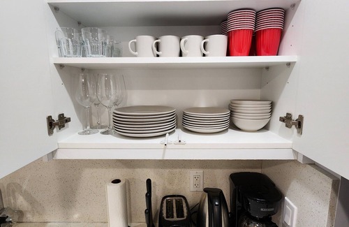 Kitchen: The kitchen area features a modern and simple layout while being able to provide all the necessary amenities and appliances needed to cook a great meal. This includes a stainless-steel refrigerator, electric stove and oven, microwave, dishwasher, toaster, and a kettle. Included is a coffee maker with complimentary coffee/tea to kickstart your morning, and popcorn, chocolate, and other snacks for your enjoyment during your stay.