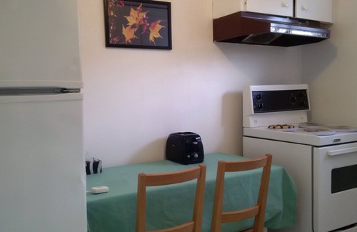 - Kitchen, dishes, utensils, fridge, microwave, stove