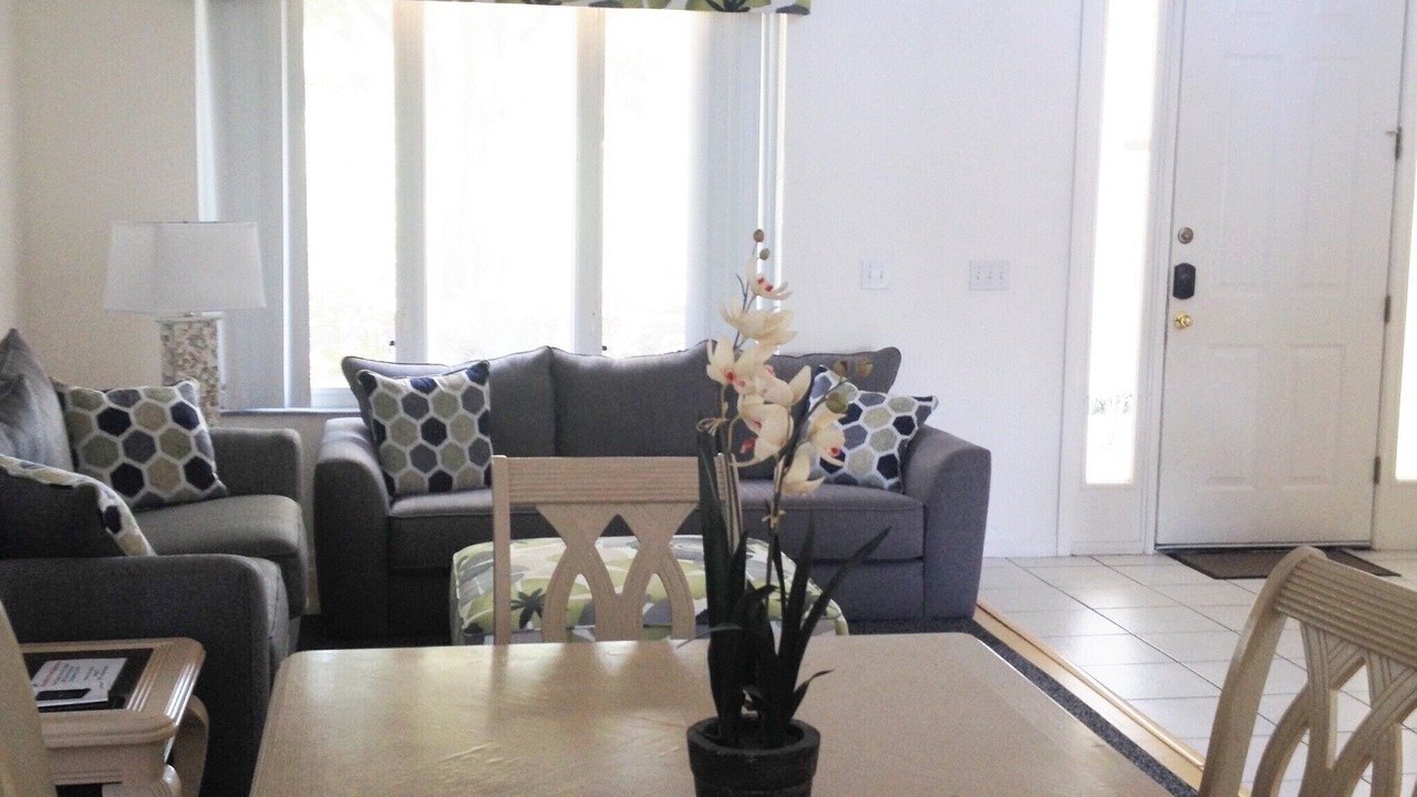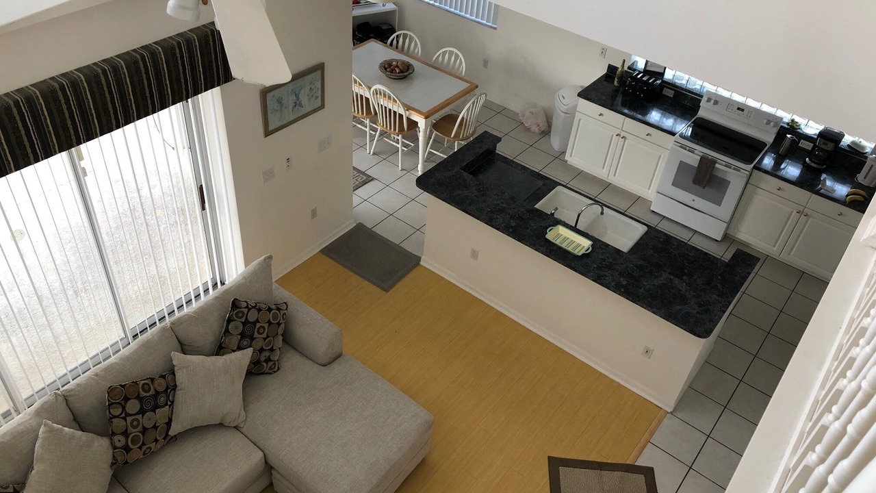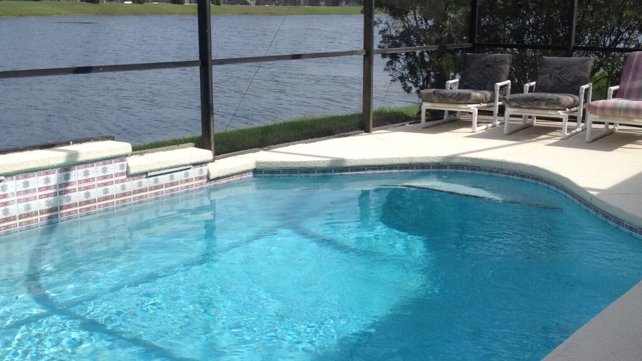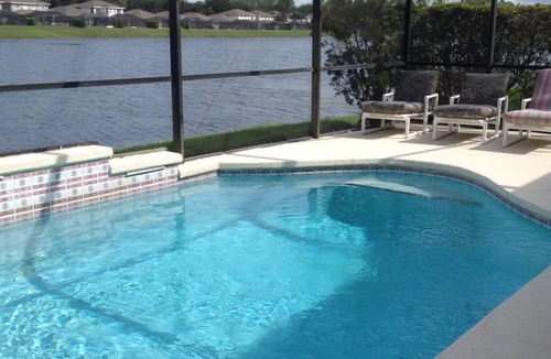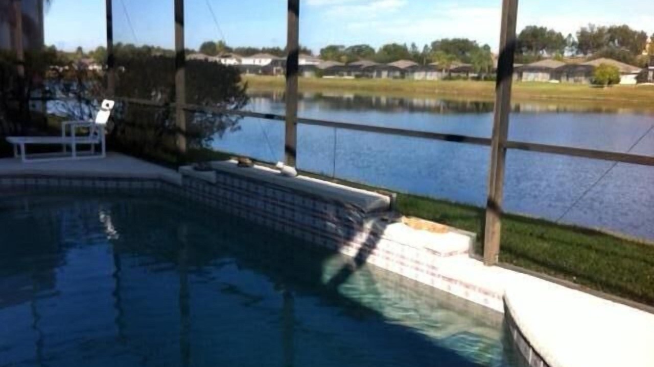 Fantastic, lakefront, 2700-square-foot, executive home. Large lanai with triple glass sliding doors, ample patio furniture, and private pool. Located in a peaceful gated community designed around two lakes, three-and-one-half miles from Disney World. Large family room with vaulted ceiling and galleried landing. Open kitchen with breakfast nook and fully-upgraded appliances. Superb master suite with second-floor balcony. Full laundry facilities. All bedrooms have cable TV. Wireless internet access.