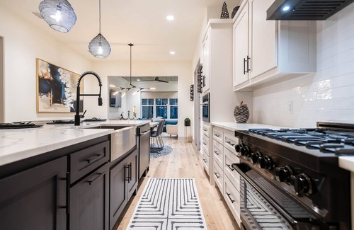 Replete with top-of-the line fixtures and appliances, the kitchen includes stainless steel fridge/freezer, five-burner gas range, dishwasher, microwave, dual coffee maker, oven, toaster and blender. The home has all of the cookware, bakeware and crockery you could need, including separate dinnerware for both adults and children. The oversized kitchen island offers seating for four people, while the main dining area seats eight. The living room offers plenty of couch and chair space along with a large smart TV to stream all your favorite shows.