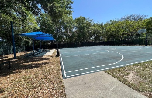 5 min away walking to park offering lifeguards at lap pool, tennis pro shop with courts, basketball and playground. Calling ahead is recommend to reserve a court.