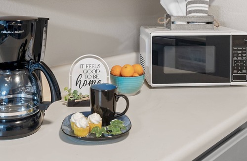 The living room features a large flat screen TV with a comfy sofa and (2) chairs, where you can snuggle up with some popcorn to enjoy movies or play games. We also have a desk for your workstation. The sliding glass door off the living room offers a private balcony with table and (2) chairs to sit outside & enjoy a great book or your favorite snack, beverage or libation.