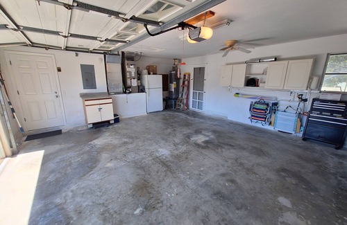 We welcome you to our Coastal Retreat home! Relax on the covered patio in our heated pool! Please inquire for Boat and RV parking on this tranquil half acre property. This home features a beautiful pool view with direct pool access in the Master bedroom, living room, kitchen, and spare bathroom. The split floor plan is perfect for any multi-family arrangement. The Master Suite features a King bed, TV, and private bathroom with a shower and garden tub. Both spare bedrooms feature queen beds with TVs . The spare bathroom is a shower and toilet shared by both spare bedrooms. Garage parking for 1 car is available.
