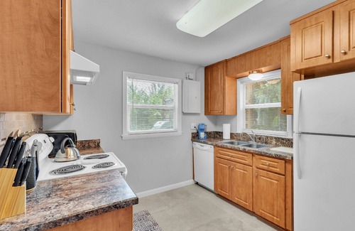 - Kitchen equipped with range, dishwasher, refrigerator, microwave, Keurig pod coffee maker, toaster & more