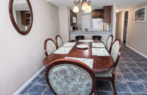 The dining area seats five, with additional bar seating for two—perfect for sharing meals, playing games, or planning your next beach adventure. The kitchen is fully equipped with granite countertops, quality appliances, and sleek cabinetry, everything you need to feel right at home.
