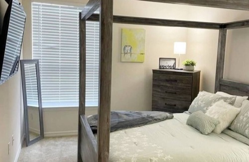This large 2/2 ba unit has three 50" TVs, Euro Pillowtop mattresses, One King and One Queen sized bed in each bedroom. USB charging lamps in each room, stainless steel appliances, full sized refrigerator, microwave, and dishwasher. Full sized washer and dryer is included as well. This is an everything included unit so utilities, cable, and wifi are included with your rent payment. Just bring your toothbrush and you'll be set. There is a resort styled swimming pool/spa, car wash on site, bark park, and a business center. The unit is very close to shopping and major highways - just 7 min to the airport. Gated communities with keyless entry, and free parking is our company standard amenities. We'd love to accommodate your Orlando stay. Video walk thru is available upon request. Less than 12 miles to over 5 major hospitals. Only 8 minutes away from Lake Nona's Medical City and Nemours Children's Hospital. Be the first tenant to occupy this our new unit.