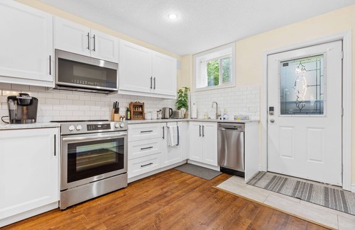 This apartment is set up to feel like a home away from home. Guests have a private entrance to the apartment on the lower level of the house. Upon entering you'll find a beautiful and spacious kitchen with ample quartz countertop space, new appliances (a full-sized refrigerator, stove, dishwasher, over-the-range microwave oven, coffee maker, kettle), all the cookware essentials you'll need, and dining space.