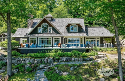 FIRELIGHT - Tucked away in a quiet bay on Lake Rosseau, this property features a gorgeous two-bedroom, three-slip boathouse and separate, professional gym in addition to the five-bedroom main cottage. The sun deck off the main cottage is tastefully furnished with outdoor lounge furniture and boasts exquisite views of Lake Rosseau. Follow the beautifully landscaped gardens and stone pathway down to the water's edge, where guests will find a spacious 1000 sq. ft swim dock and boathouse.