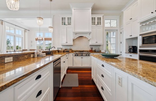 Natural light fills the main-level great room, adorned with wicker accents, glittering chandeliers, and floor-to-ceiling French doors. There’s room to gather with a sofa and 2 armchairs around the Smart TV, plus 2 additional armchairs beside the 10-person dining table. The gourmet kitchen is a chef’s dream, boasting high-end appliances, ample counter space, and a 5-stool breakfast bar. Enjoy a refreshing drink on the covered balcony’s cushioned furniture or at the 8-seat alfresco table. Off the dining area is a second outdoor space with a 2-person bistro set, daybed, and outdoor kitchen. Retire for the night in the luxe primary bedroom with a king bed and private bathroom.