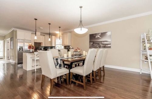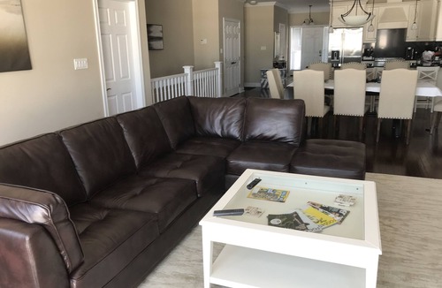 Stay in luxurious comfort: Primary bedroom with king-size bed, window facing the water and a full ensuite located on first floor. Bedroom 2 with king-size bed with window facing the water. Bedroom 3 with a queen-size bed. Bedroom 4 with 2 queen-over-queen bunk beds, which is great for kids! There is also air conditioning and a laundry room with a full-size washer and dryer. The living room has a electric fireplace and a large sectional sofa.