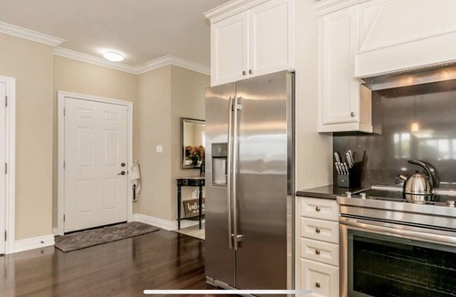 Modern kitchen is fully loaded with dishwasher, full-size fridge, full-size stove and oven, microwave, filtered water system, pots, pans, baking dishes, serving ware, cutlery, utensils, air fryer, blender, crock pot, espresso machine with milk frother, coffee maker, toaster, kettle, some condiments and spices, tea and coffee, napkins, dish soap and hand soap.