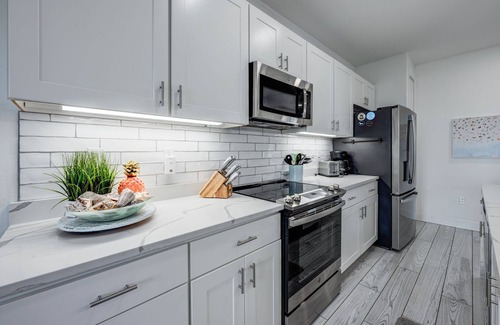 Modern Comforts: Central air conditioning, tasteful décor, and a fully equipped kitchen with full-size appliances and a sleek island seating four.