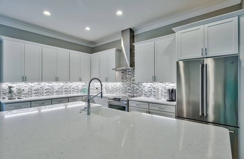 The first floor is flooded with natural light for everyone to enjoy with an open floorplan featuring a gourmet kitchen with an oversized island featuring quartz countertop and top of the line appliances, a spacious living room, and dining room area. The private plunge pool features color-changing lights and the fenced-in patio features chaise lounges to relax all day! Also, enjoy grilling out on the back patio or make smores and enjoy your own private bonfire.