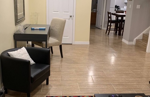 Your own apartment fully furnished cleaned and complete with full kitchen (stove, fridge, microwave, dishwasher), living room, bedroom with queen bed and closet, bathroom, washer and dryer in the apartment, lots of storage space throughout entire apartment, separate entrance with parking (left side of house)