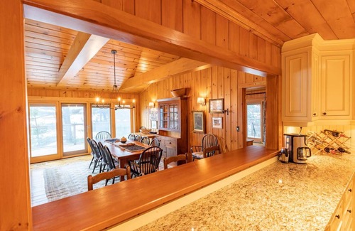 Overlooking the panoramic view of the lake, the inviting family dining room beckons a good time surrounding an extended dining table with seating for 12 or more!