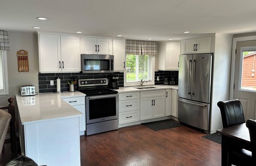 This recently renovated four season cottage is located in the Haliburton Highlands region - approximately 2.5 hours from Toronto. The cottage is beautifully finished and furnished with open concept main living areas. The living area has an electric fireplace, flat screen TV, satellite dish, reclining sofa and loveseat and a couple of chairs for large crowds. The kitchen is equipped with fridge, stove, dishwasher, microwave, air fryer, toaster, coffee maker, blender, water dispenser, dishes, etc.
