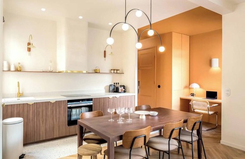 Housed in a classic Art Deco building, this apartment boasts timeless elegance with modern amenities. Three spacious bedrooms, each overlooking the peaceful courtyard, feature king-size beds (180x200 cm), private en-suite bathrooms, and 4K OLED TVs. The bright and inviting living room includes a sofa bed, a large dining table for eight, and a 4K OLED TV. A dedicated workspace makes this an ideal choice for remote workers. The modern kitchen is fully equipped, perfect for preparing meals, though the area’s incredible dining scene might tempt you to eat out.