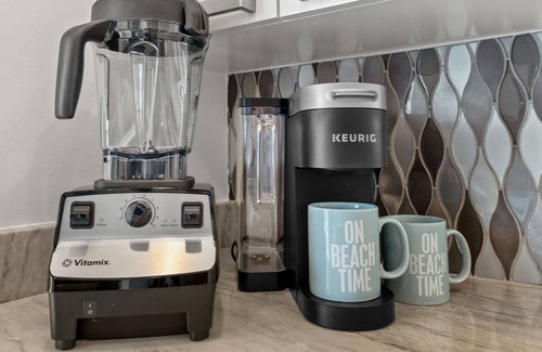 The kitchen is equipped with a Keurig, a drip coffee pot, coffee grinder, Vitamix mixer, Brita Water Pitcher plus everything else you would expect!