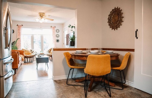 Norman by the River is a bright and airy space filled with natural light. The main floor includes two bedrooms with queen beds, a cozy living area with a leather couch, papasan chairs, and a 45" smart TV, plus a full kitchen with dining area and dishwasher. The spacious entryway offers generous storage, and the bathroom features a large rainfall shower. Guests also have access to a separate laundry room and a quaint loft space via a staircase in the second bedroom.