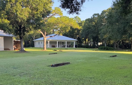 Secluded home located on four acres of oaks, pines and palm trees. —Breakfast included! Eggs, Frozen Waffles, Pancake mix, syrup & Butter. —Enjoy your coffee on the front porch as the Sun peaks through the trees! —King bed in master bedroom & large double shower.