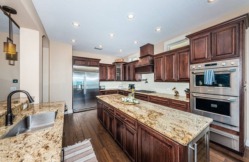 The fully equipped kitchen has stainless appliances, granite counters, casual bar seating and natural lighting. The kitchen features a large island. You can prepare home-cooked meals in this fully equipped gourmet kitchen.