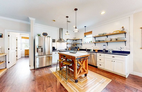 This fabulous beach home enjoys a beautifully appointed open floor plan with tasteful decor throughout. Make yourself at home and spread out comfortably in the welcoming living room furnished with comfy sofas and a TV with cable. The chef's kitchen has been equipped with all stainless steel appliances and European open-concept shelving. It has all the essentials to prepare memorable homemade meals and treats for the group. The primary suite can be found on the main level, featuring a TV and an en suite bathroom with a custom-tile shower with a frameless entry.