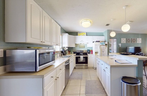 An open floor plan and upgraded fixtures create a bright and inviting space, plus the home is equipped with all the modern essentials, including a 50-inch TV in the living room, so guests can feel right at home. The true gem though is the home's enclosed backyard, beautifully landscaped with mature, Florida palms and native trees. A large, floating deck serves as the centerpiece of the yard, with seating for four. With access to a gas grill too, there's bound to be countless hours spent hanging out with friends and family.