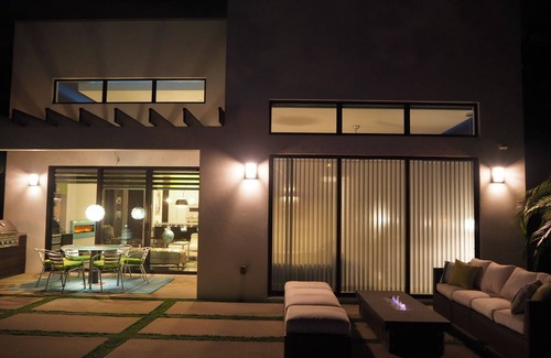 Private yard continues the flow of the modern, urban interior with lush palms combined with contemporary concrete divided by astro turf. The heated 34’ x 12’ pool has a 10' sun ledge complete with a pair of ledge loungers and side table (no glass in the pool area please). A long, custom fire-pit is surrounded by low-level seating with Sunbrella cushions and a turquoise ceramic water feature provides a stylish focal point.