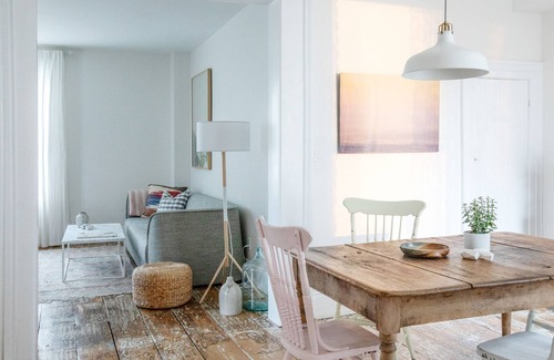 The Garden Suite is a one bedroom suite. This beautiful space offers a queen bedroom, a spacious dining room and living room with a queen sleeper sofa for two children under 10, a charming gas stove to heat the unit, a foodie-equipped kitchen, a modern renovated bathroom with rain shower and heated floors, and a private front porch shaded by an old maple tree.
