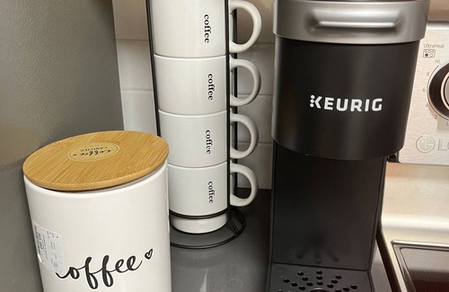 Our kitchen consist of dark white wooden cabinetry, grey quartz countertops and stainless-steel appliances plus all customary household items giving you everything you’ll need to make your favorite home-cooked meals. A large orange original painting serves as a focal point in keeping with the Florida theme. We also have a Keurig coffee station so you can start your morning right!
