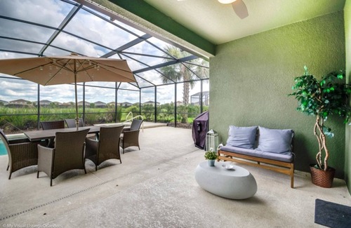 This 5-bedroom, 4 and Half -bathroom home has space and fun for everyone in your family . Everyone in your family will love having their own space on this vacation. All bedrooms are equipped with an HDTV and DVD or game system. Cool off in the screened-in private pool with a spillover spa, grill out poolside under the lanai, or gather everyone around the in the living area for a movie night. This luxurious home also includes a fully equipped kitchen, dining area, laundry room, two-car garage and complimentary high-speed Wi-Fi.