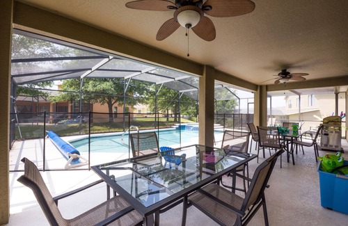 Our kitchen features stainless steel appliances and is stocked with stoneware and flatware for twelve, along with every cooking utensil and small appliance imaginable. (Be sure to set aside at least one morning to make Mickey waffles with our Mickey waffle maker—you’ll find the waffle mix included in our generous amenities basket!) Outside, our enclosed lanai contains a large stainless grill and shaded dinner seating for twelve—complete with outdoor ceiling fans.