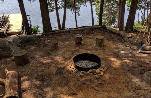 Starting down at the lake, there is an expansive on-land deck with two built in cargo-net style hammock beds right at the waters edge, with a long finger dock with amble boat parking. There is an 8'x 8' floating swim raft off shore, and both an easy shallow entry with stairs, or deep water off the end of the dock for jumping off of. The deck offers a sweeping view of the bay and out to the main channel past Muskadasa Island, and enjoys all day sun right to sunset. The typical breeze keeps the bugs away much of the season, and provides a great respite from the heat on warmer summer days. Up from the dock area is a terraced fire pit with fire ring and some firewood provided. Sit around and roast marshmallows, or just enjoy the fire light on the trees, and when you're done, we've made it easy by providing a tap and hose right at the pit for dousing the fire.