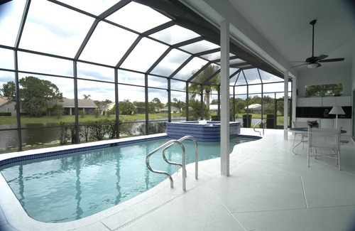 It features 2621 sq.ft. under air with a screened in heated pool and jacuzzi.Electric pool heater available for additional fees. This home has been tastefully decorated and has a very true Floridian look. The Master Suite features a King Size Bed, private bath with a separate tub & shower, a walk in closet, and private entrance to the Pool.There are two additional bedrooms one with a Queen bed and the other bedroom has twin beds. There is also an office with a computer and printer and pull out sofa.
