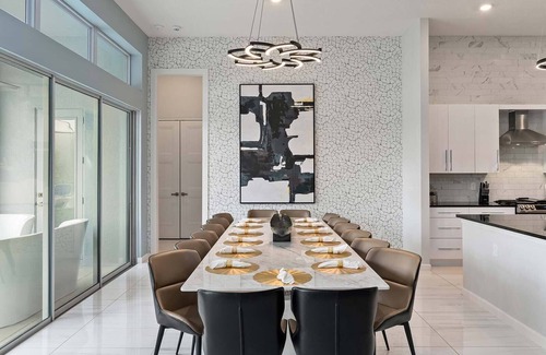ENTRANCE/GREAT ROOM: Get your first taste of this 7,200-square-foot mansion in the elegant and welcoming grand foyer. Then, relax and reconnect with your guests in the gorgeous, Contemporary-style great room with its big-screen TV and glamorous furnishings.